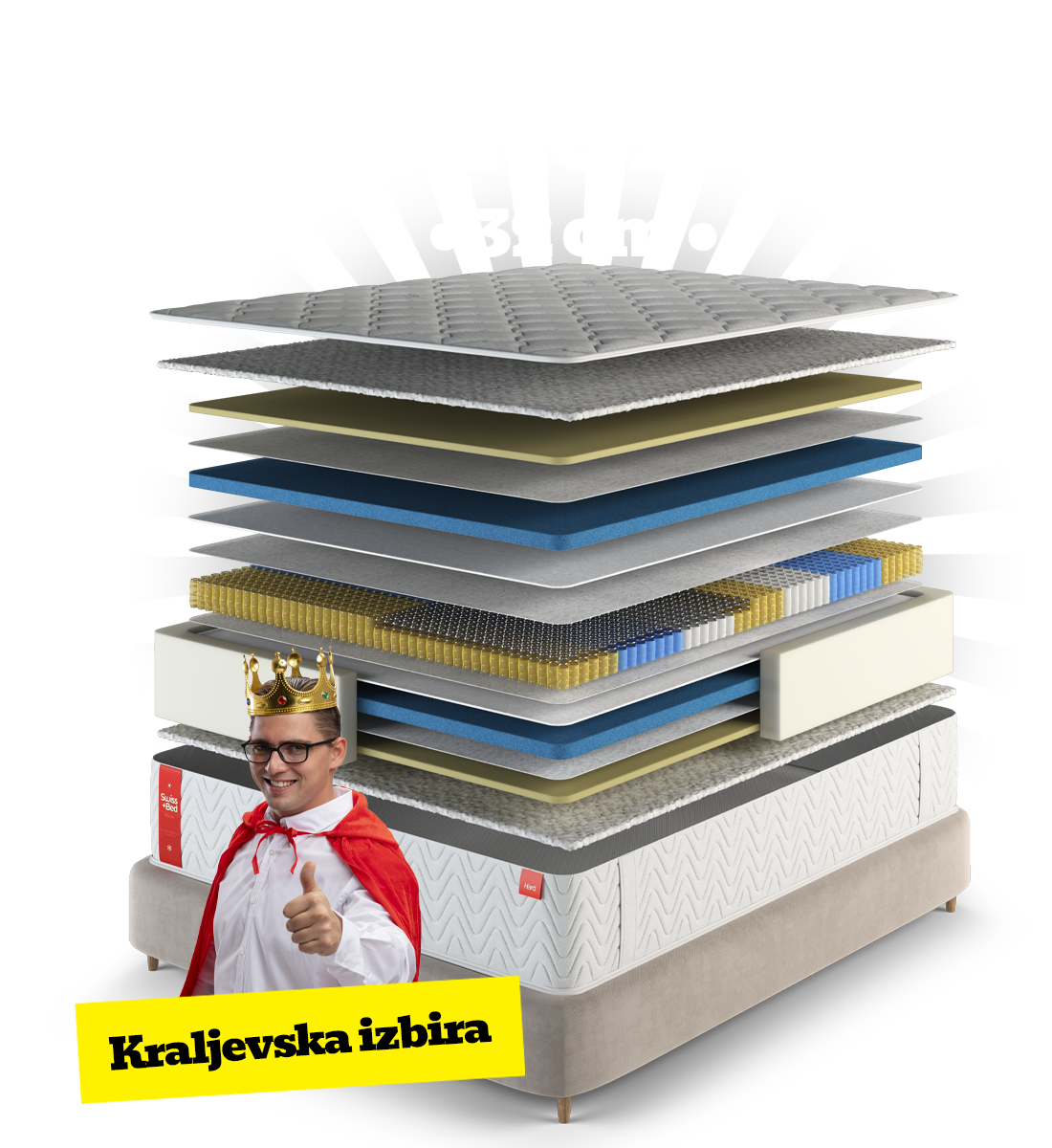 Vzmetnica iz 13 skrbno izbranih plasti zagotavlja optimalno prilagajanje telesu. Vsaka plast s svojo funkcijo omogoča popolno podporo, razbremenjuje pritisk in zagotavlja izjemno udobje za miren, sproščujoč spanec.